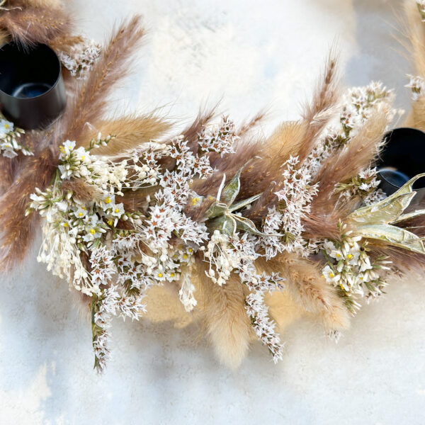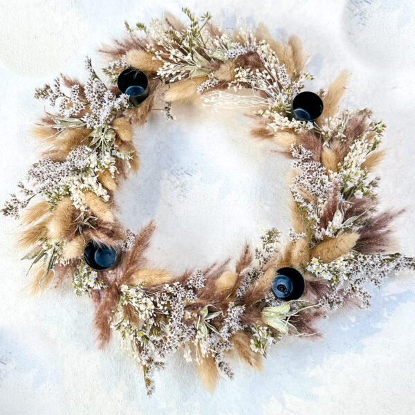 Der Adventskranz besticht durch seine Trockenblumen, die ihm eine natürliche Note verleihen. Jeder Kranz wird von Hand gefertigt und mit Liebe zum Detail gestaltet, was jedes Stück zu einem Unikat macht. Der schwarze runde Kranzstecker sorgt für einen modernen Look und passt perfekt zu jeder Einrichtung. Durch seine hochwertige Verarbeitung ist der Kranz langlebig und zeitlos, sodass Sie ihn jedes Jahr wieder verwenden können.