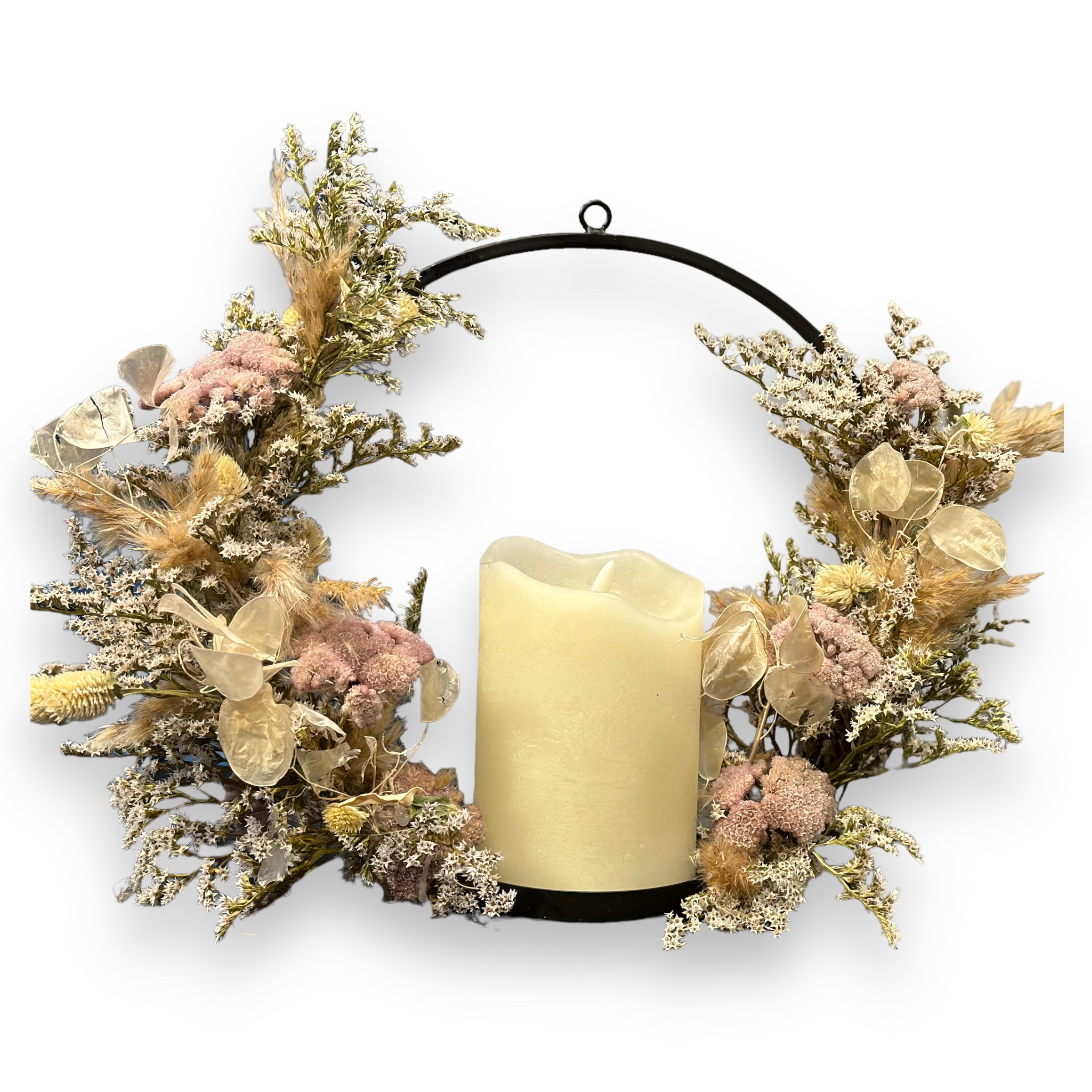 Dank des stabilen Stumpenkerzenhalters lässt sich eine Kerze mühelos in die Blumenarrangements integrieren. Das sanfte Kerzenlicht taucht den Raum in eine warme und gemütliche Atmosphäre und sorgt für Entspannung pur. (Aus Sicherheitsgründen empfehlen wir LED-Kerzen zu benutzen. Im Online-Shop erhältlich)