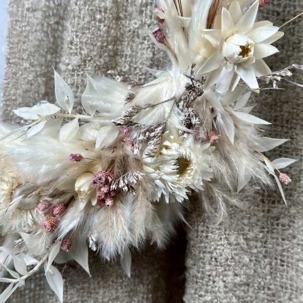 Verwendete Blumen: Trockenblumen – Mix Strohblume, Ruscus, Langurus
