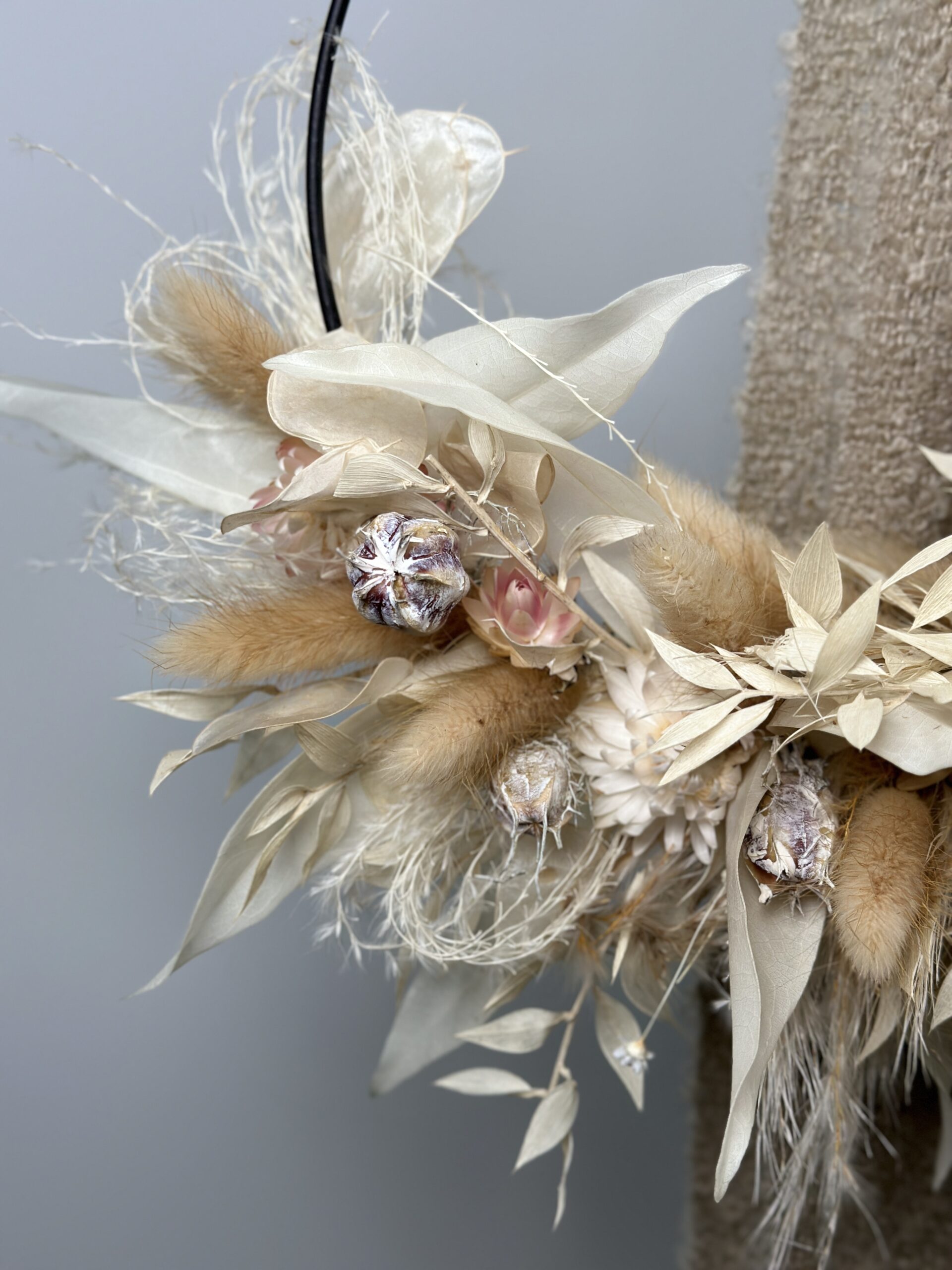 Verwendete Blumen: Trockenblumen – Mix Strohblume, Schleierkraut, Cocculus, Ruscus, Nigelia