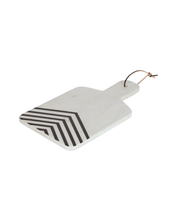 Hergestellt aus feinstem Marmor und mit sorgfältig eingearbeiteten Intarsien ist dieses Servierbrett bestens geeignet für die Präsentation vielseitiger Speisen. Die praktische Aufhängung aus Leder gibt dem Brett eine feine rustikale Note. Mit seinem grafischen Muster in kontrastreichen Farben liegt dieses It-Peace voll im Trend und macht aufgehängt oder lässig an die Wand gelehnt auch einfach als Dekoobjekt einiges her.