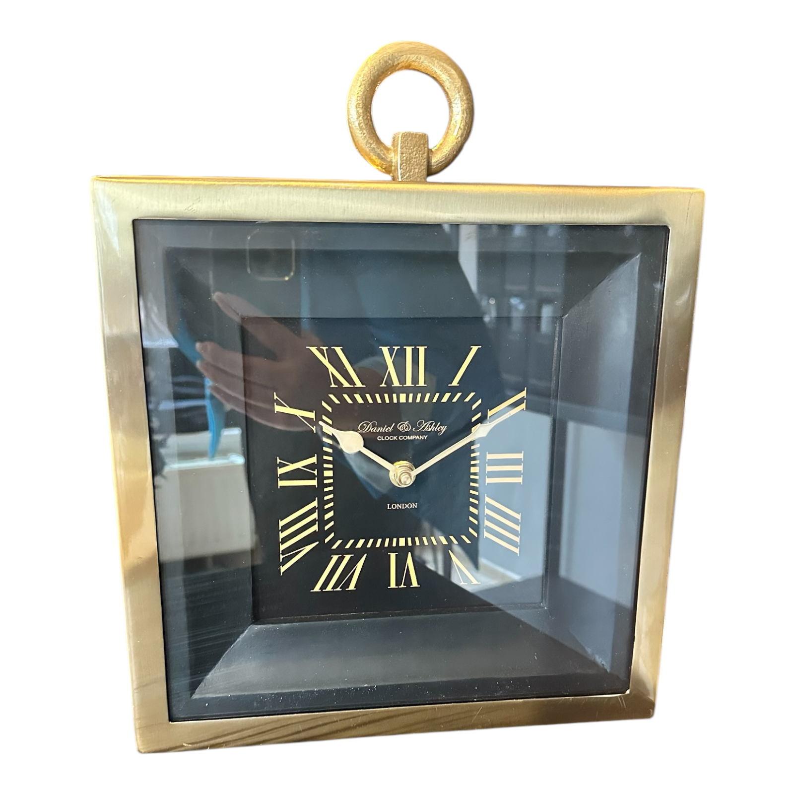 Elegante Tischuhr im Stil einer Taschenuhr mit goldfarbenem Metallrahmen und umlaufendem Glasgehäuse. Schwarzes Zifferblatt mit goldenen römischen Ziffern und filigranen Zeigern sorgt für einen stilvollen Vintage-Look. Ideal als dekoratives Highlight auf Sideboard, Schreibtisch oder Fensterbank.