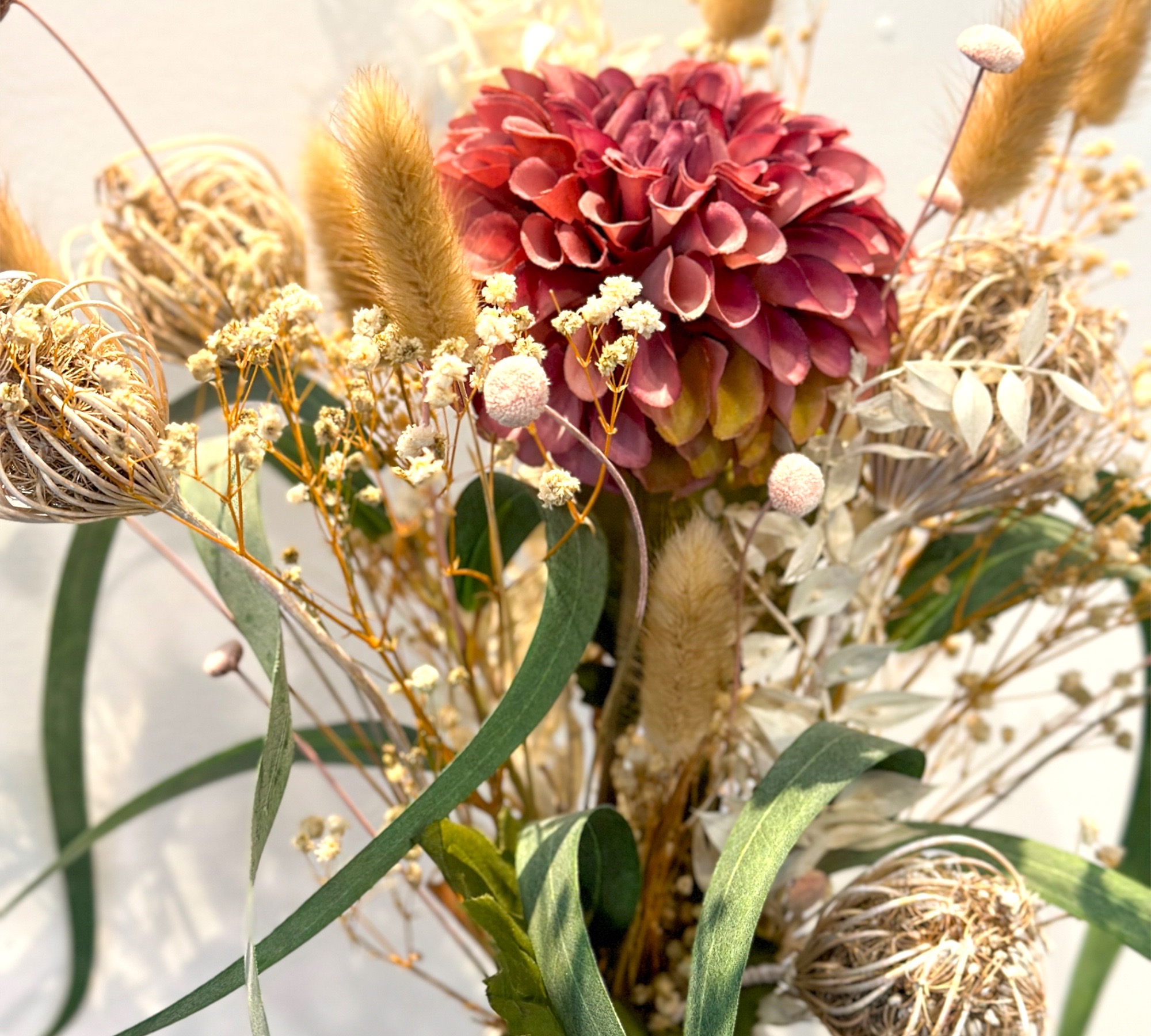 Mit unserem zauberhaften Trocken-Blumenstrauß Dalia bringen wir die Schönheit und Eleganz von Blumen in Ihr Zuhause. Jeder Blumenstrauß wird sorgfältig und mit Liebe zum Detail von uns gefertigt. Das Ergebnis ist ein atemberaubendes Arrangement, das nicht nur für einen Moment Freude bereitet, sondern jahrelang anhält.